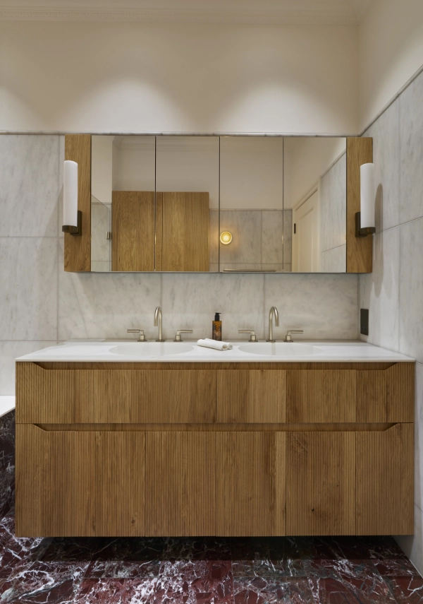 Working collaboratively, we transformed the apartment into three bedrooms and relocated the kitchen into the open-plan reception room, creating a more natural heart to the home. In partnership with Rebecca of Studio Pike, we developed a carefully considered material palette and bespoke joinery – including a kitchen manufactured in Italy – designed to read as finely crafted furniture, with appliances seamlessly concealed.