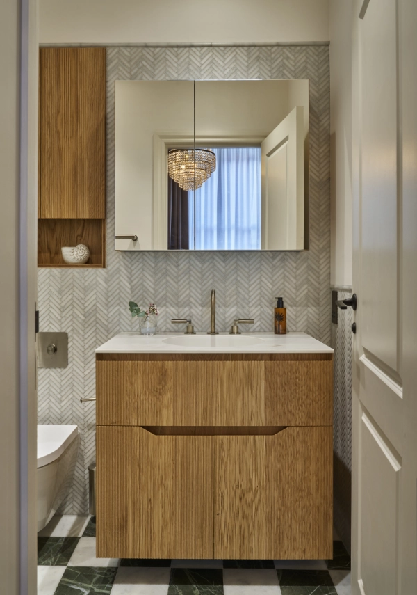 Working collaboratively, we transformed the apartment into three bedrooms and relocated the kitchen into the open-plan reception room, creating a more natural heart to the home. In partnership with Rebecca of Studio Pike, we developed a carefully considered material palette and bespoke joinery – including a kitchen manufactured in Italy – designed to read as finely crafted furniture, with appliances seamlessly concealed.